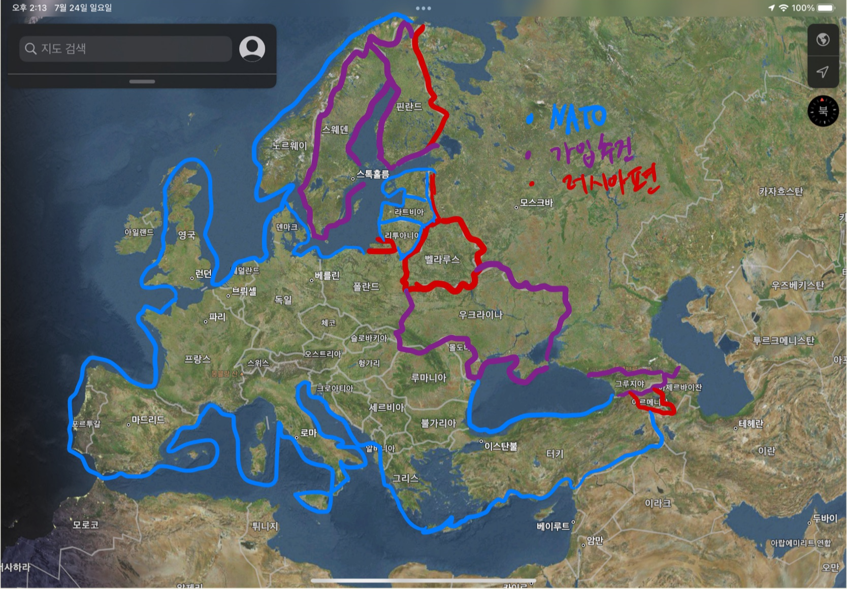 보라색 부분이 파란색이 된다면 심장지대로 향하는 동유럽의 관문이 뚫리게 된다. 러시아로서는 속이 탈만 하다. 그런 연유로 크림반도를 강제 병합시키는 것은 러시아 입장에서는 할 수밖에 없는 일인듯 하다. 특이한점은 그루지야도 NATO 가입을 추진하고 있는 모양이다. 그루지야는 과거에 러시아한테 개겼다가 하루도 안돼 수도가 러시아군에 점령당하는 일을 겪었었다.(부시 행정부때인데 도와주지 않았다.)